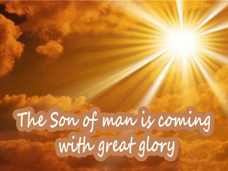 “The Son of man is coming with great glory” Scripture: Luke 21:20-28 20 “But when you see Jerusalem surrounded by armies, then know that its desolation has come near. 21 Then let those who are in Judea flee to the mountains, and let those who are inside the city depart, and let not those who are out in the country enter it; 22 for these are days of vengeance, to fulfil all that is written. 23 Alas for those who are with child and for those who give suck in those days! For great distress shall be upon the earth and wrath upon this people; 24 they will fall by the edge of the sword, and be led captive among all nations; and Jerusalem will be trodden down by the Gentiles, until the times of the Gentiles are fulfilled. 25 “And there will be signs in sun and moon and stars, and upon the earth distress of nations in perplexity at the roaring of the sea and the waves, 26 men fainting with fear and with foreboding of what is coming on the world; for the powers of the heavens will be shaken. 27 And then they will see the Son of man coming in a cloud with power and great glory. 28 Now when these things begin to take place, look up and raise your heads, because your redemption is drawing near.”